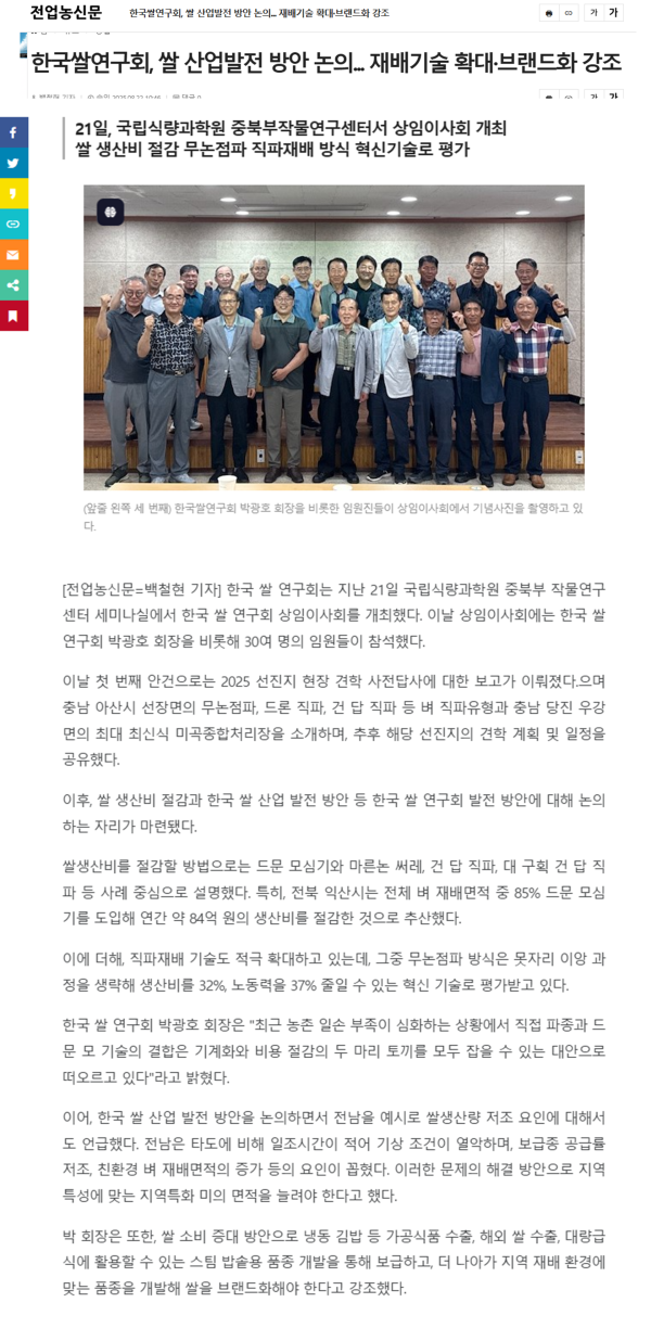한국쌀연구회, 쌀 산업발전 방안 논의 재배기술 확대 브랜드화 강조